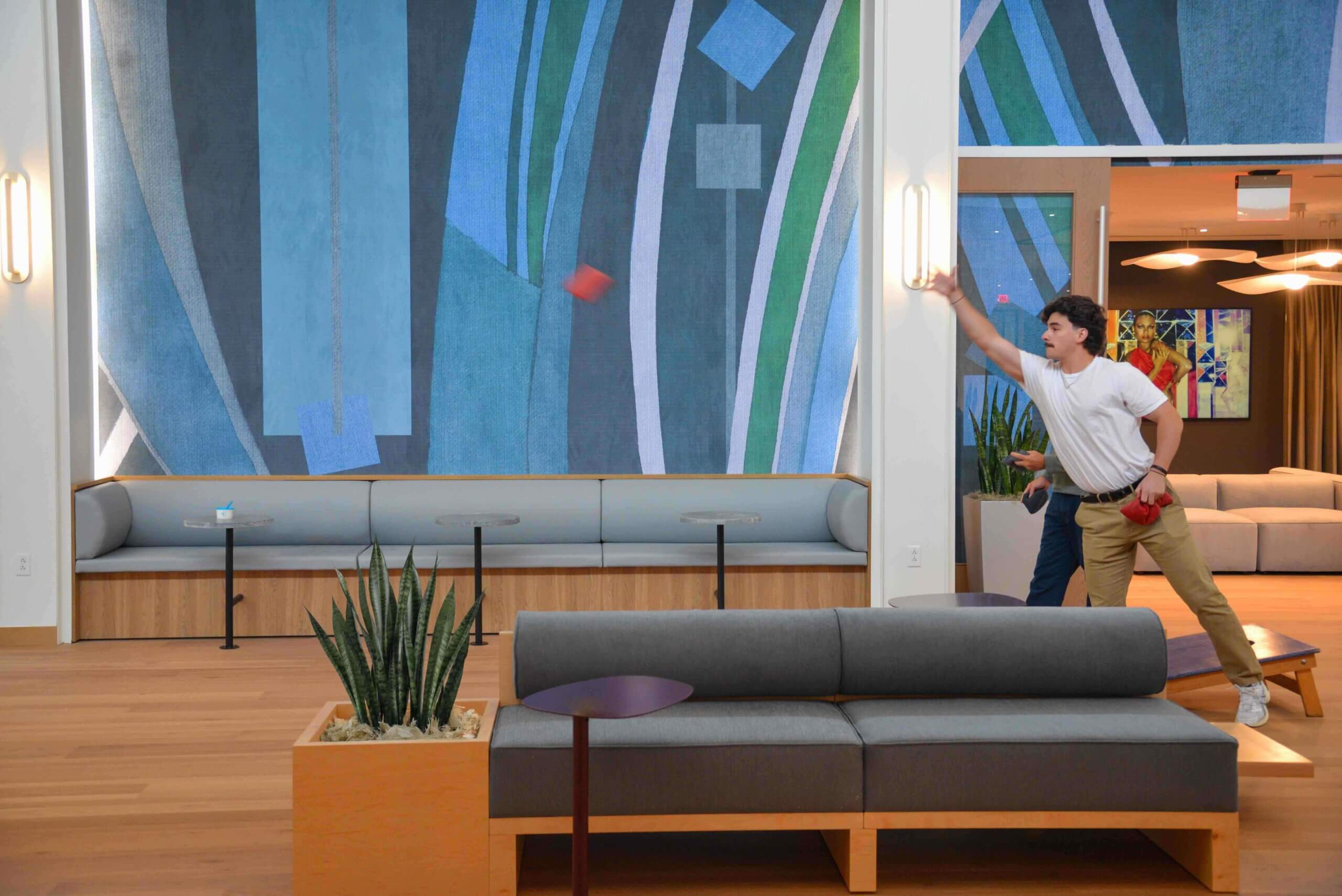 Casual conference rooms transform into ping-pong and cornhole areas, and a tucked-away speakeasy offers an intimate spot for private work or small gatherings.