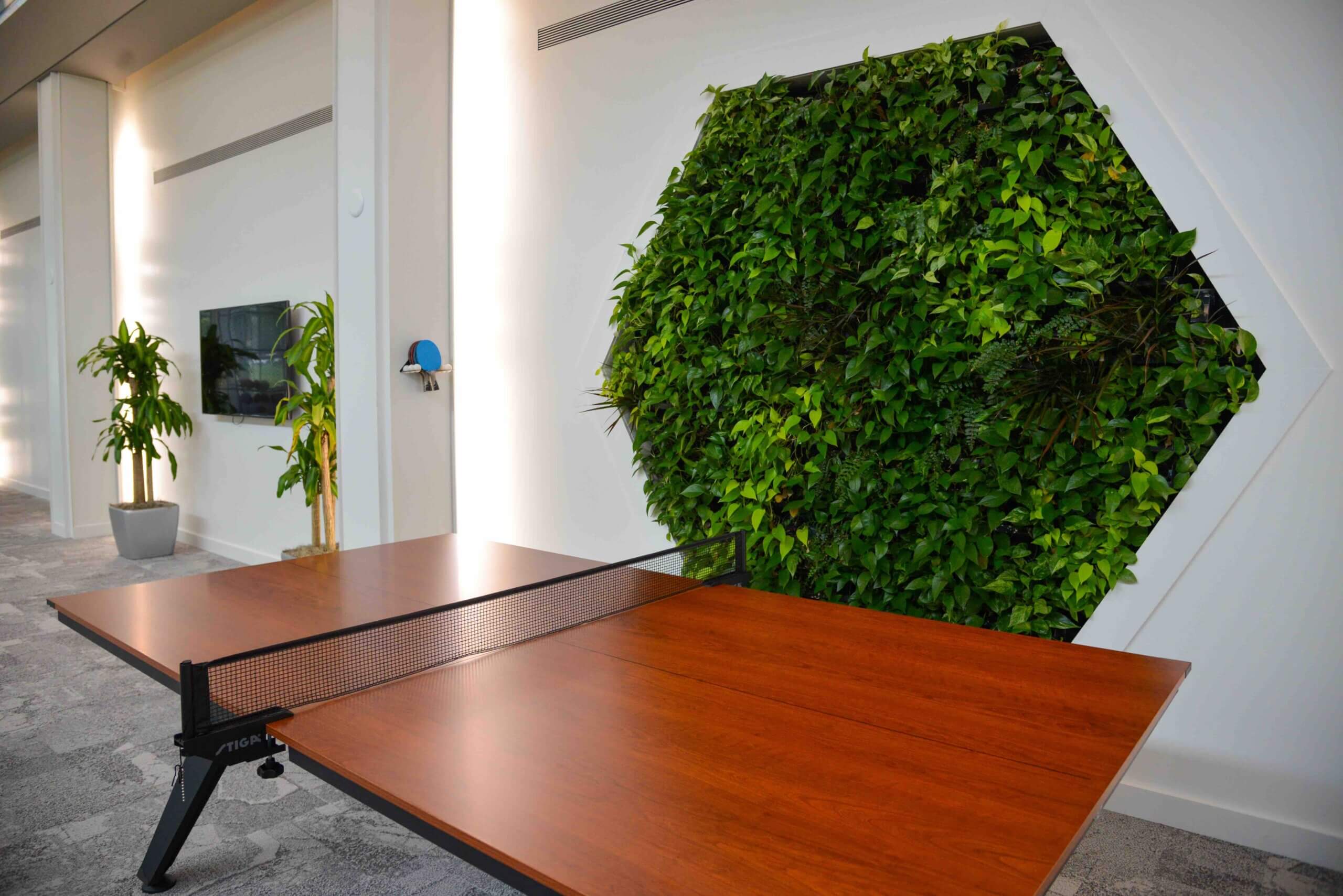 The interior design embraces biophilia, maintaining existing green walls and adding new plantings to create a calming atmosphere.