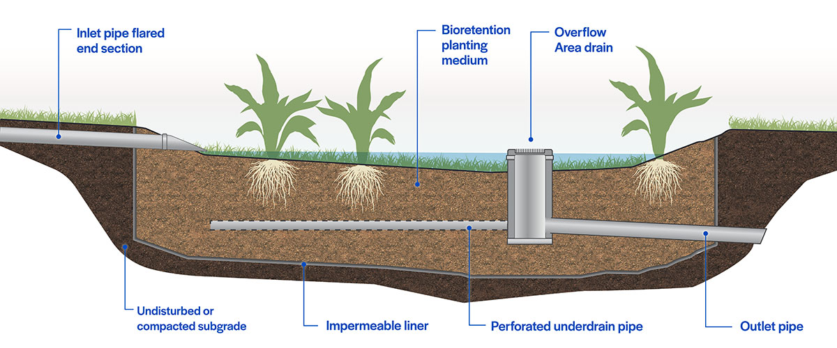 SMMA developed a coordinated set of green infrastructure strategies—including bioretention areas, bioswales, and level spreaders—that capture, slow, and treat runoff on site instead of sending it downstream.