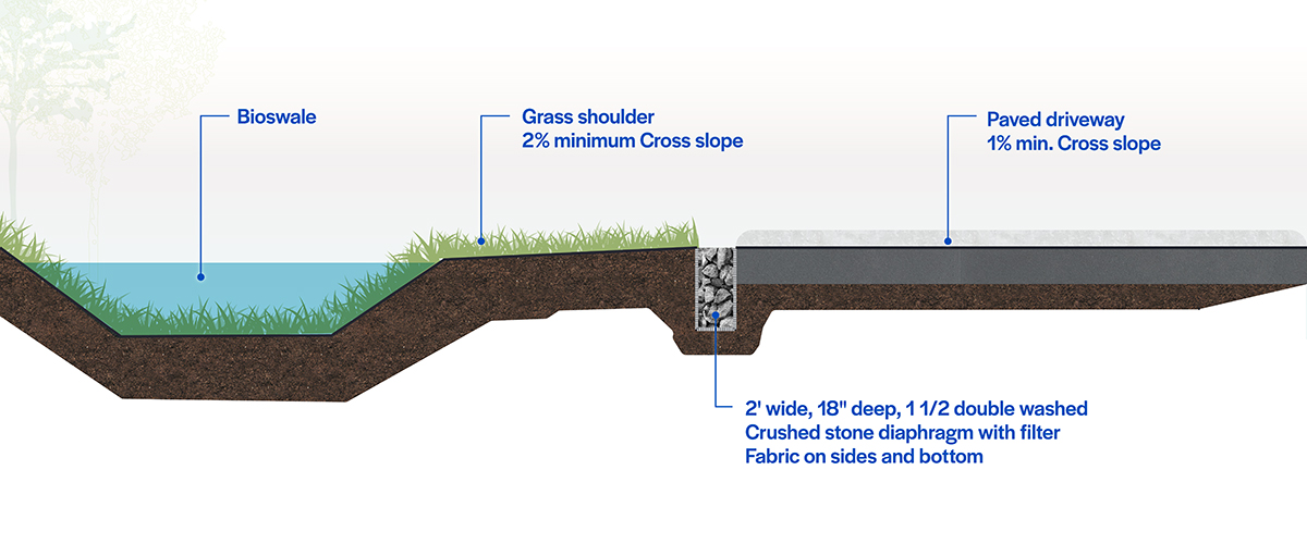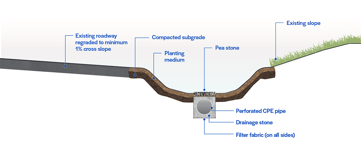 The bioswales along the side of the regraded roadway at Location D capture and treat runoff at the source, mitigating downstream flooding.