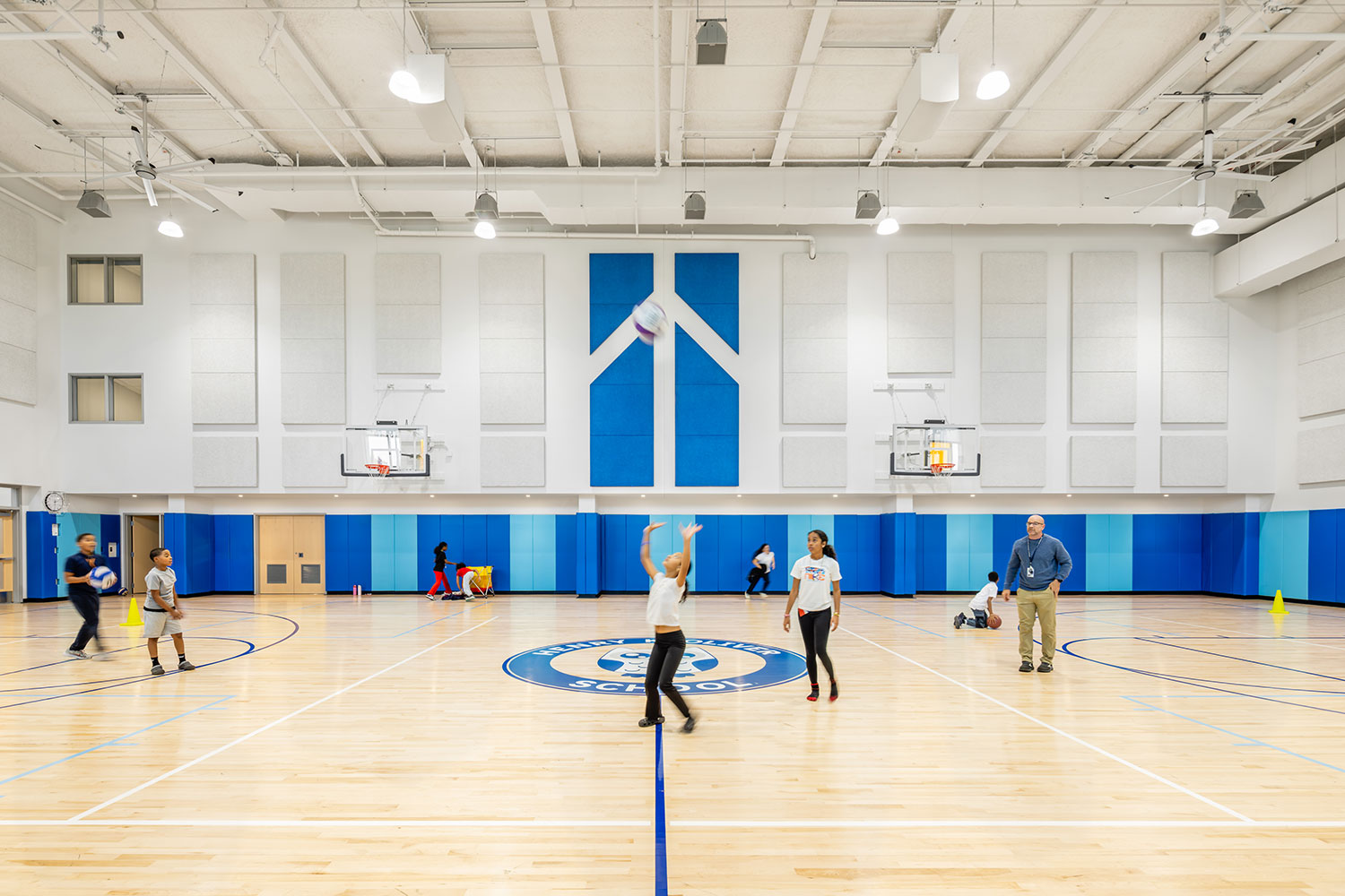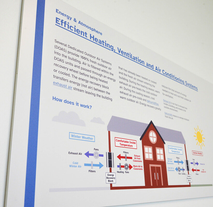 For larger spaces such as the gym, the team used an Energy Recovery Units (ERU) system rated up to 10,000 CFM (cubic feet per minute). This system recovers about 90% of the energy from the exhaust air. In the gym, the team also installed four ceiling fans to prevent stratification (hot air rising to the ceiling) and help maintain a uniform temperature.