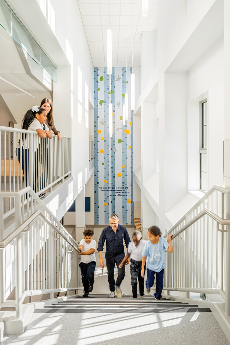The double-height “Birch Wall” honors Robert Frost, poet and alumnus of the original Oliver School. Frost’s former home, a registered historical landmark, neighbors the school.