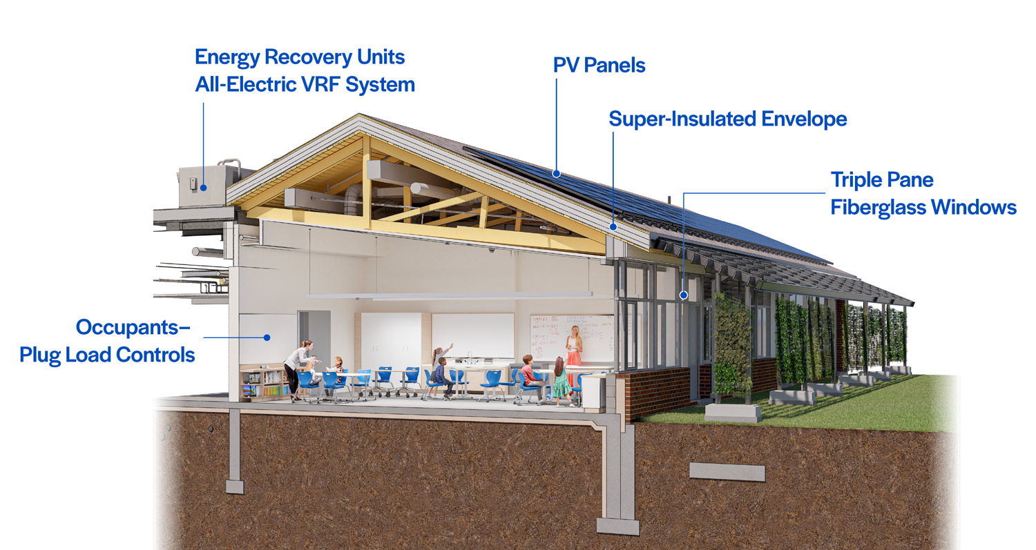 The net zero energy design reduces the building’s ecological footprint and serves as an educational tool for students, staff, and parents.