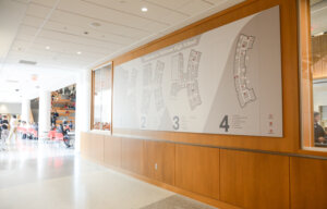 - On the first floor, a welcome and orientation space offers easy access to the second-floor auditorium and gym.