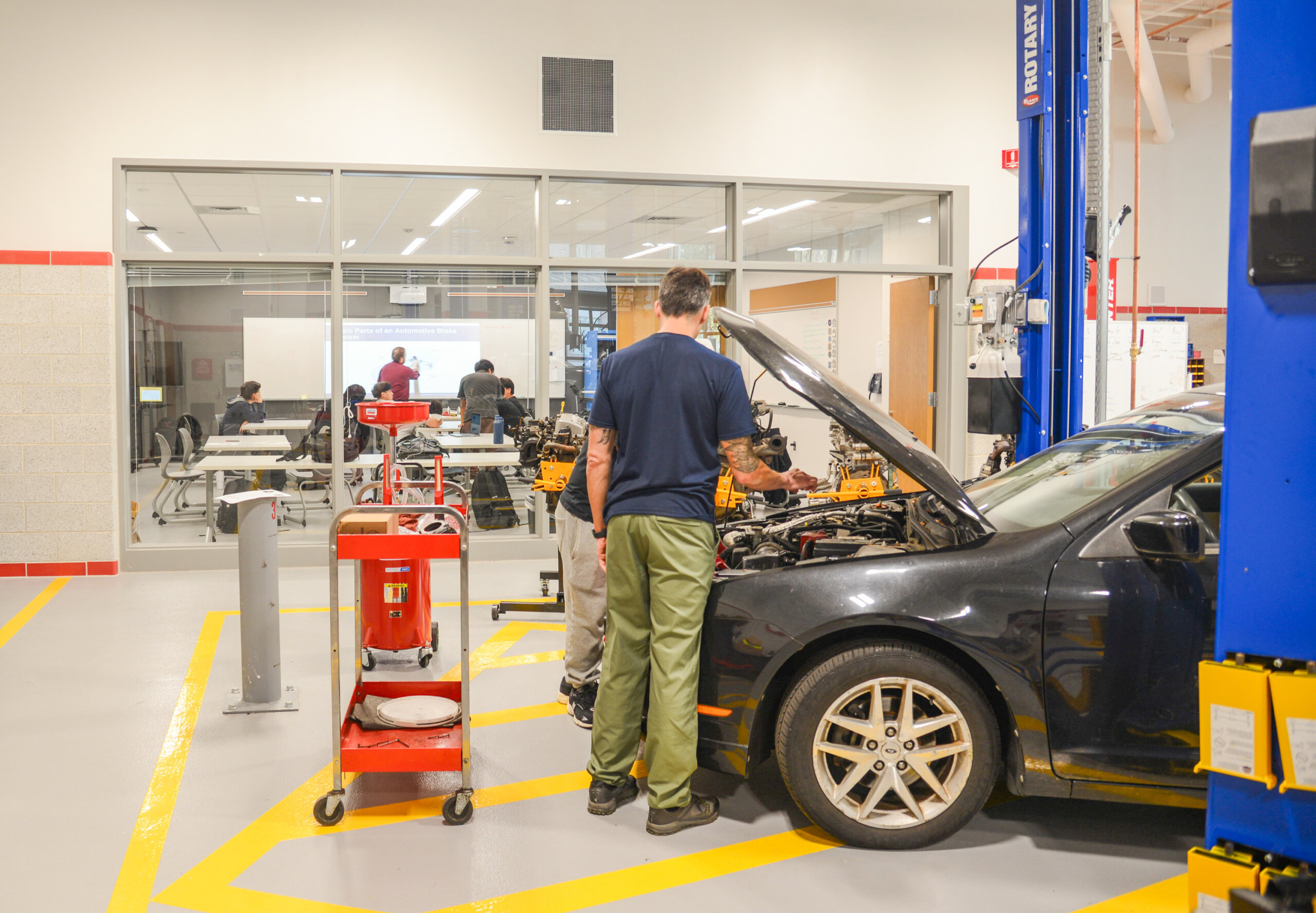 By creating a “working courtyard”, the design allows for easy vehicle access where the public can drop off their cars for repair. The CTE locations placement also minimizes the visual impact of the larger spaces while still allowing for plenty of natural light through windows and glazed garage doors. In the front half, smaller CTE spaces sit based on specific needs and adjacencies with academic programs.