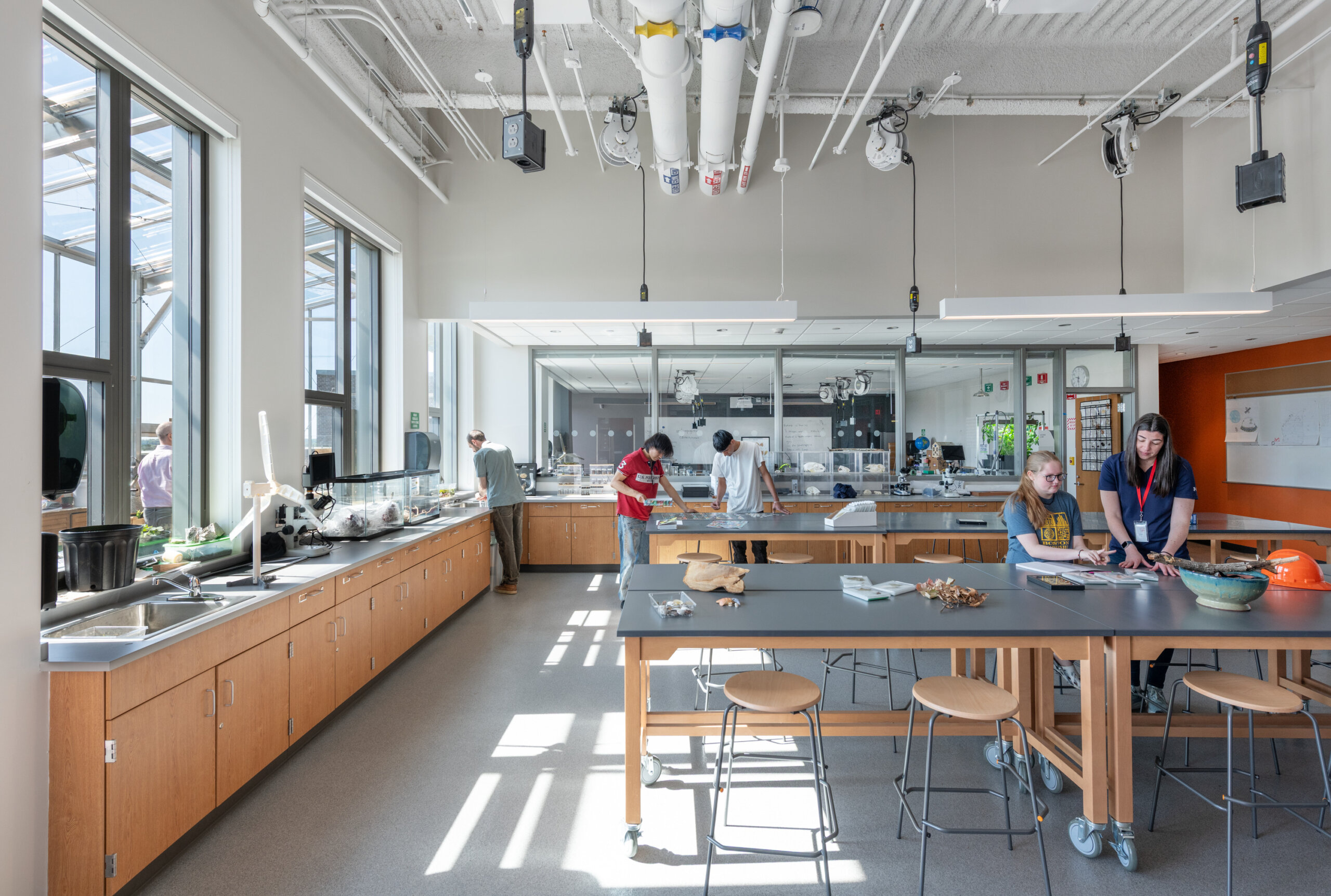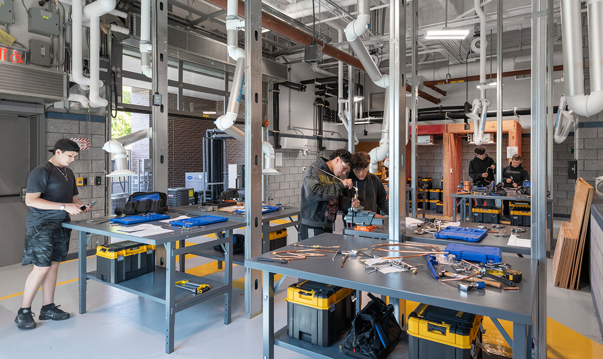 Waltham’s rich history of craftsmanship comes full circle in the school’s hands-on, vocational learning programs where 14 new CTE spaces are set to inspire the next generation of makers and innovators. These dedicated spaces allow for both theory and practical application, with lab spaces designed for “making” and other forms of authentic learning. Auto technology and collision repair, carpentry, electrical work, and HVAC nestle into the site’s natural slope.