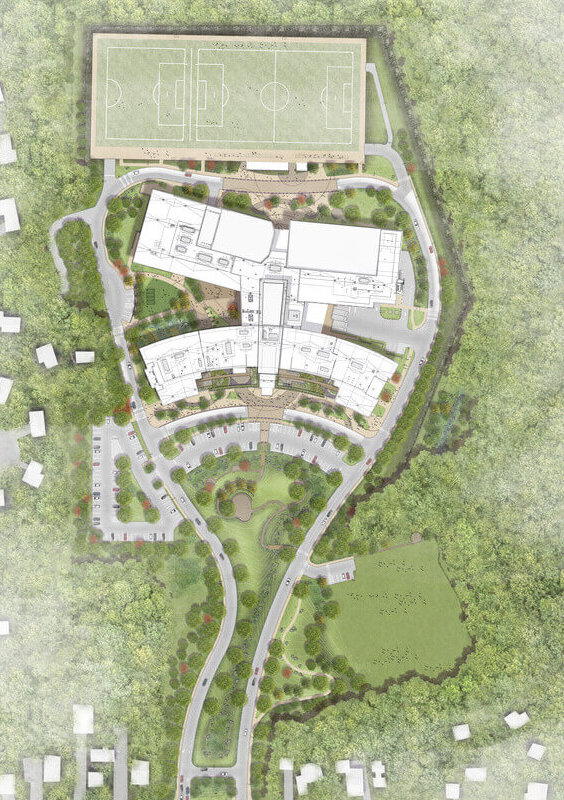 The site plan preserves a section of forest, sparing it from the clearing and blasting required by an earlier plan that located the playing fields near the school entrance.
