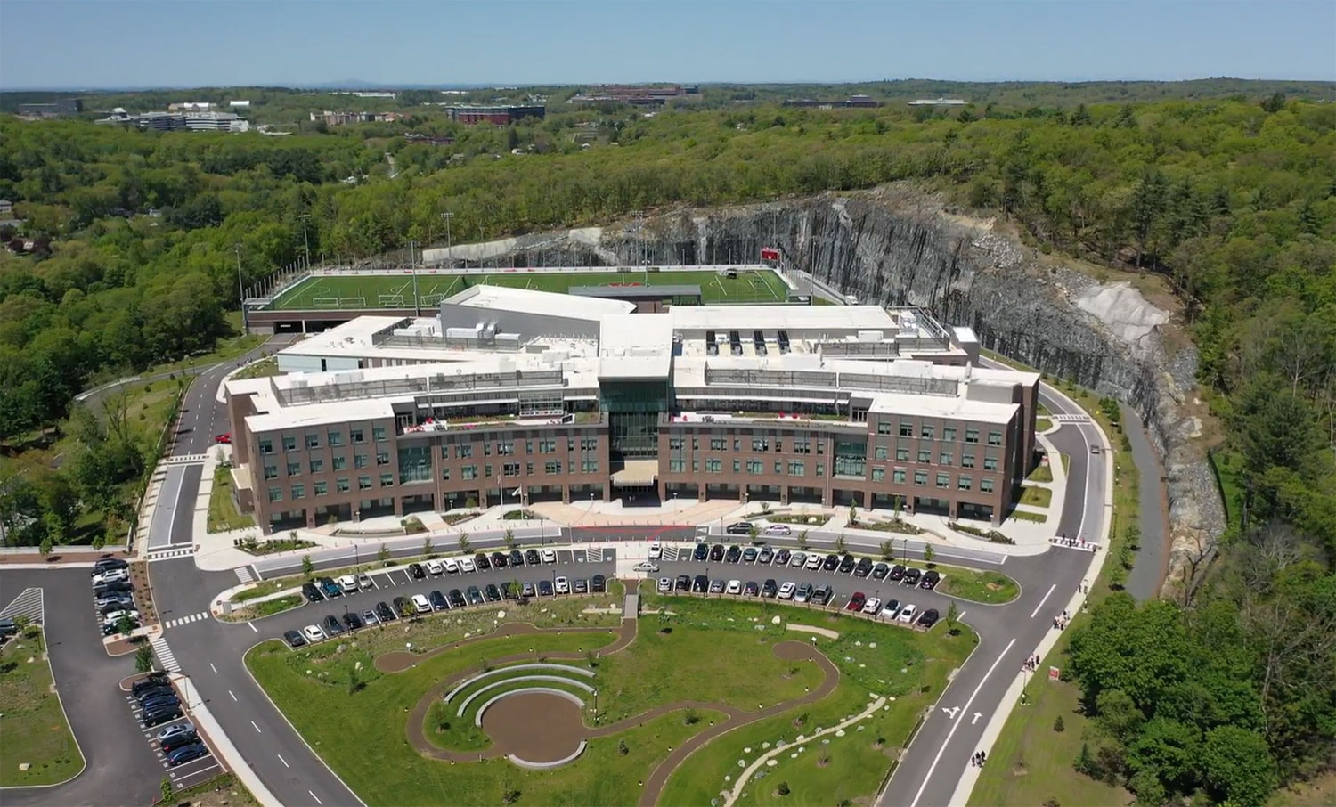The Waltham community made clear its desire to leave much of the site untouched and available for future use. After spirited discussions among local stakeholders, a solution was reached: design a tightly planned four-level school building and stack the playing fields on top of parking.