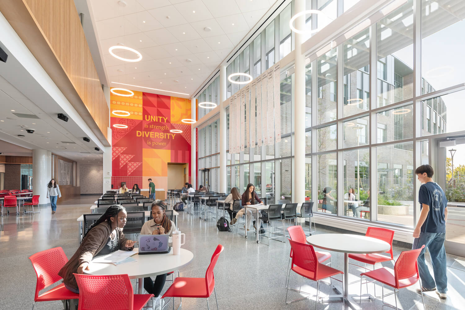 With multiple food service options beyond the dining commons, including a cafe in the media center, students can choose where to eat breakfast and lunch, boosting opportunities for chance encounters and collaboration.