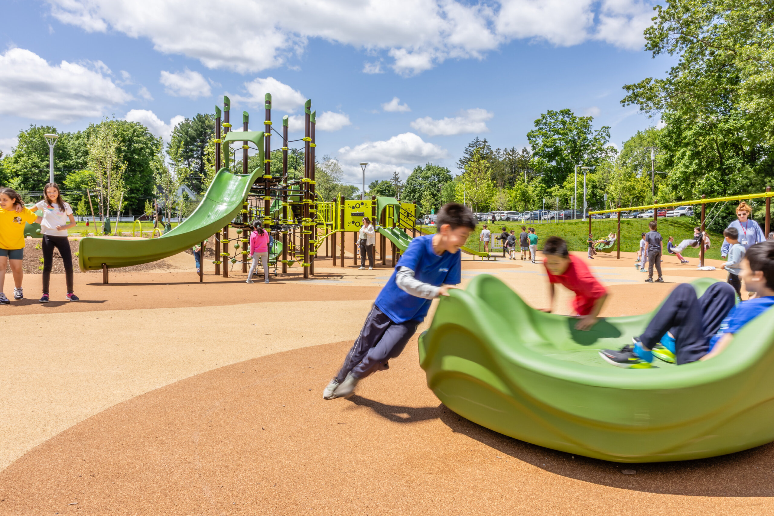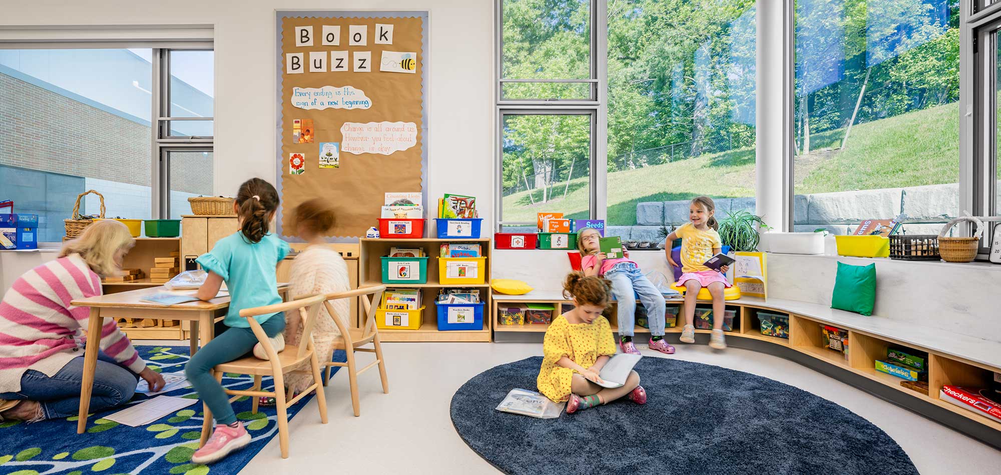 Outdoor areas include structured play, open play, and outdoor classrooms tucked into quieter areas of the site, taking advantage of topography and vegetation.