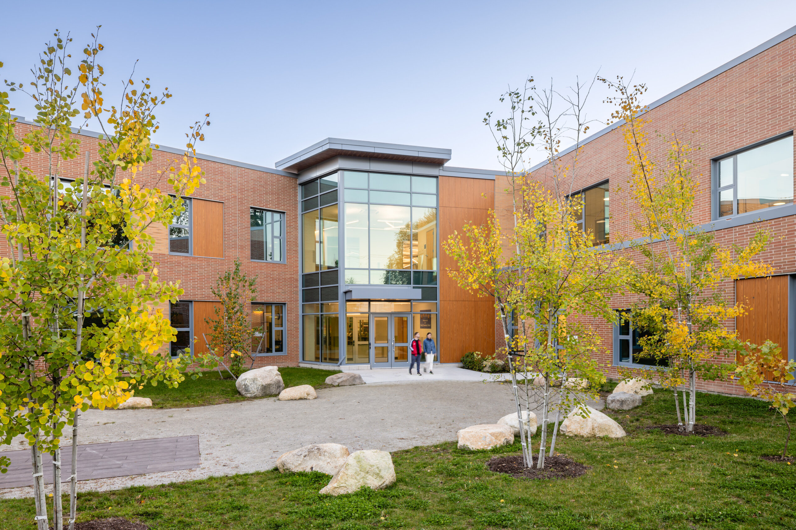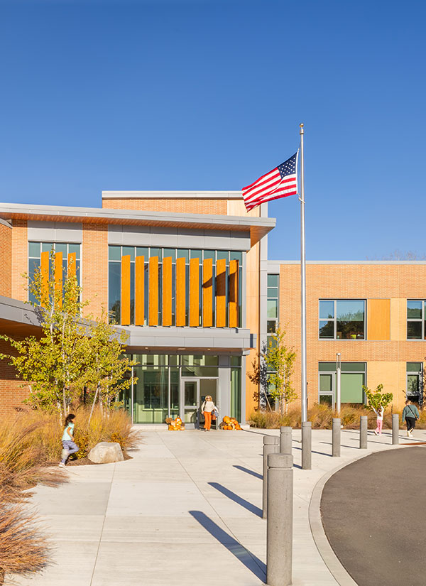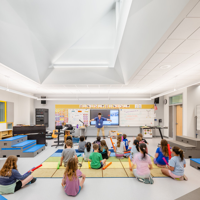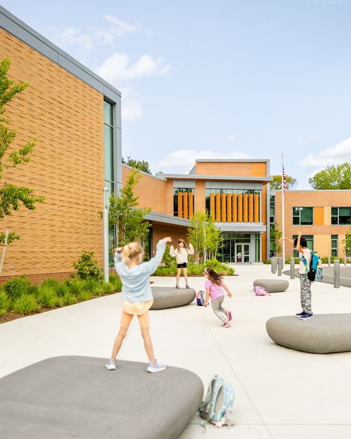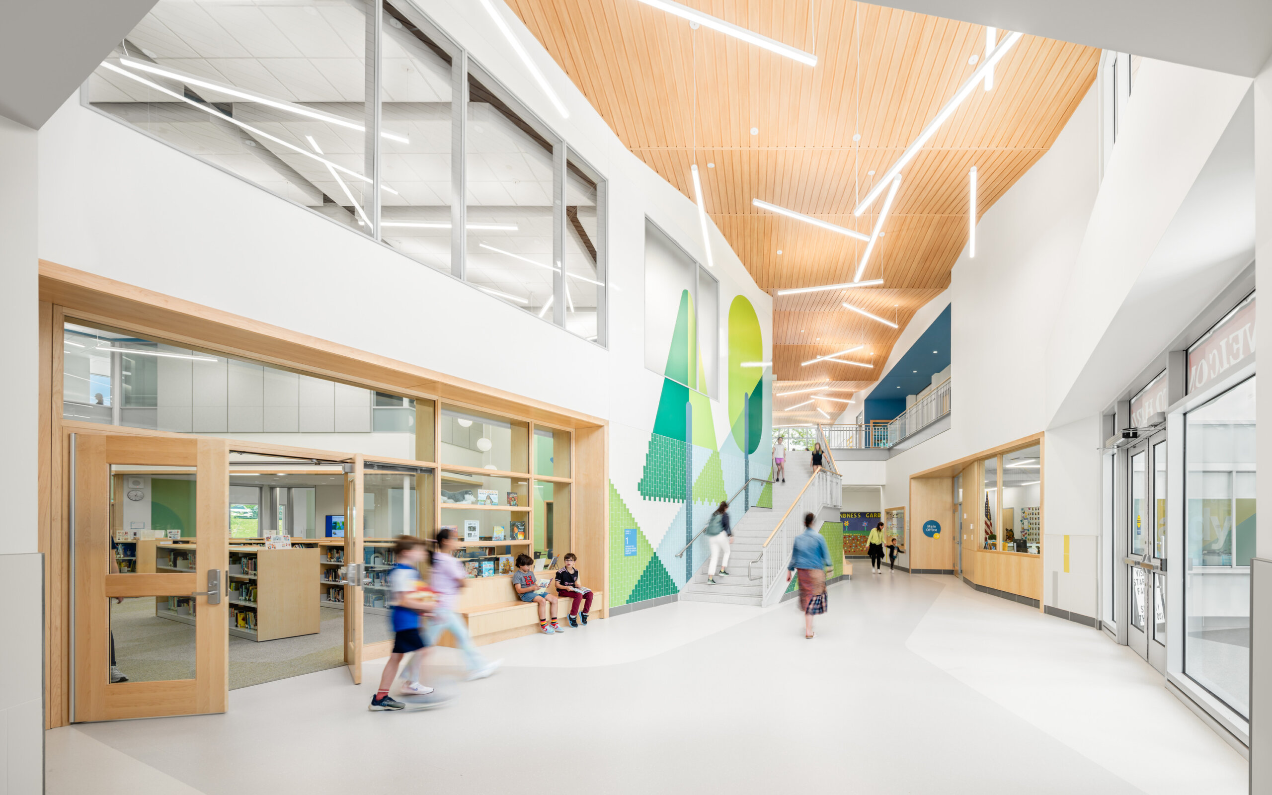 Randomized and consistent glazing is strategically placed to maximize natural daylight within classrooms and accentuate corner spaces, creating a bright and inviting learning environment.