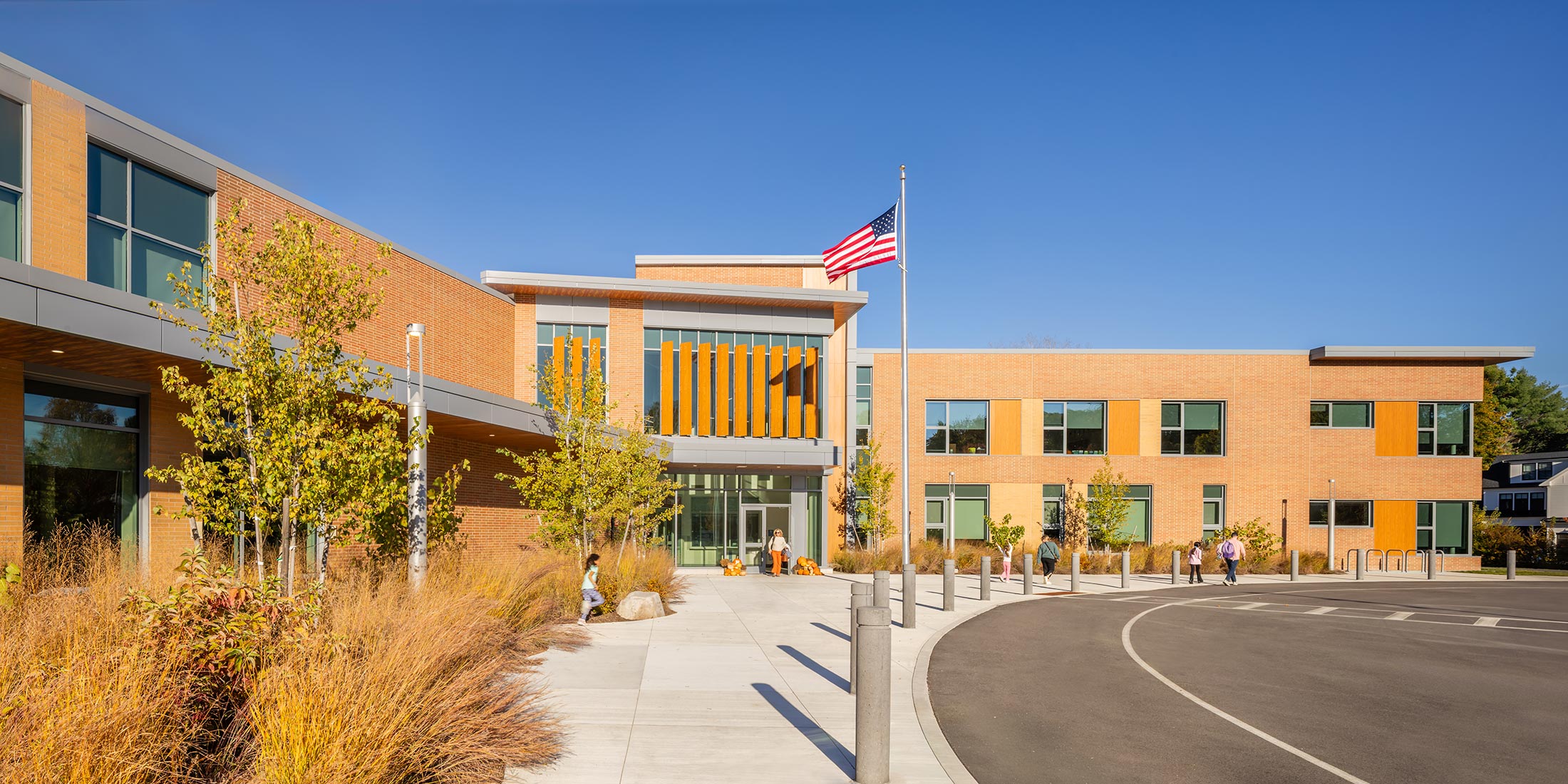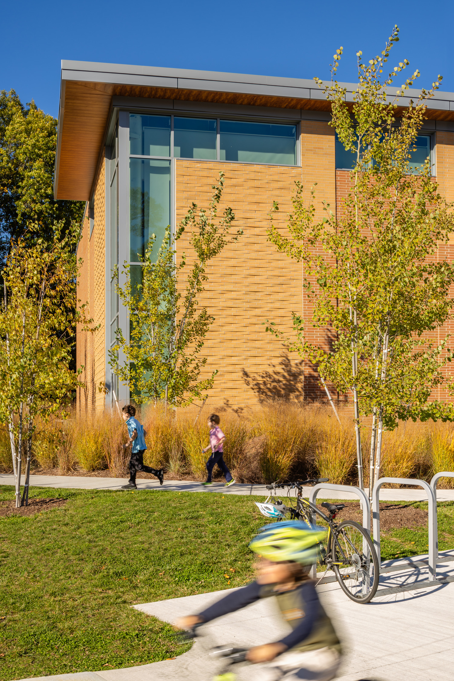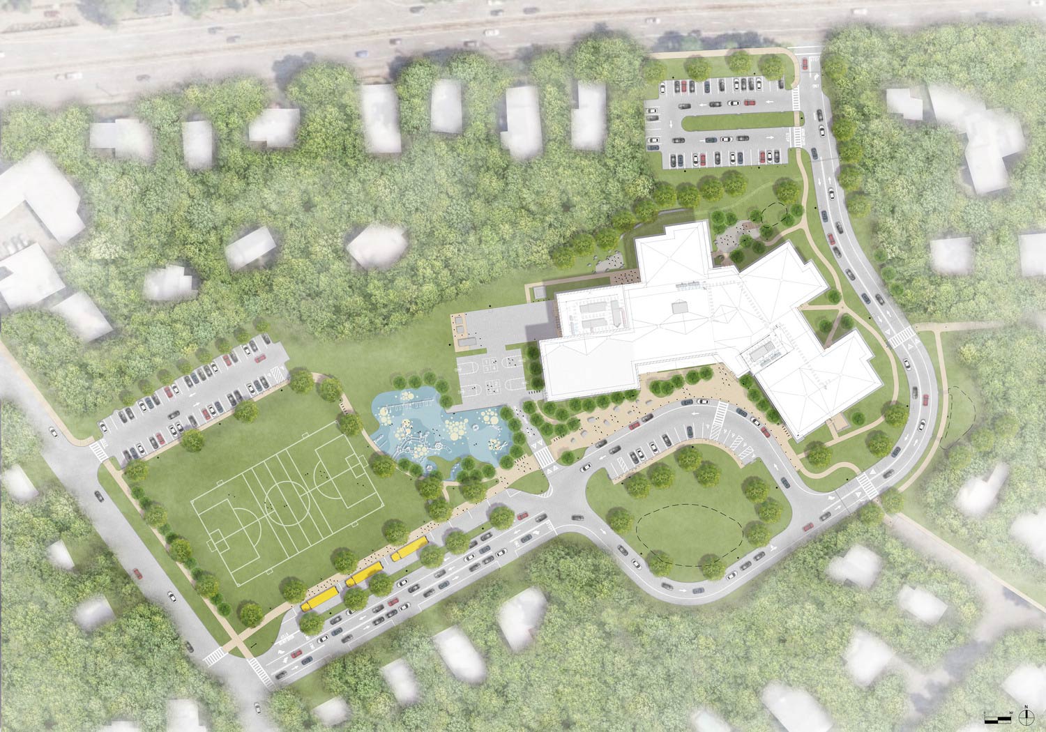 Wellesley residents’ preference for car drop-off and pick-up for their children created a potential traffic issue on Weston Road at the south-western entry. The design team conducted over a dozen circulation studies to arrive at a solution that fits up to 112 cars on site for queuing while ensuring safe pedestrian and bus movement.