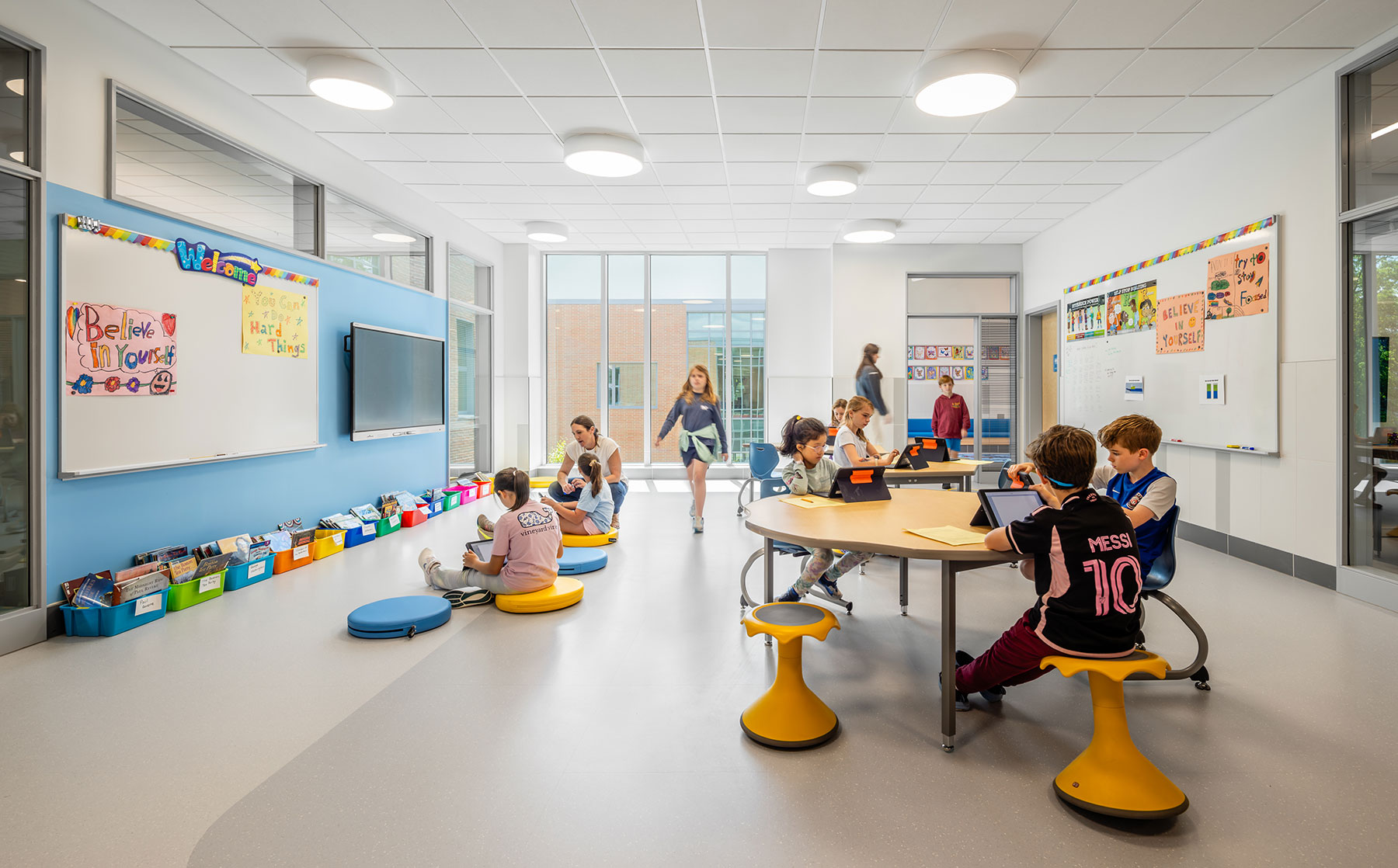 These neighborhoods consist of a central Learning Commons surrounded by three classrooms and a special ed room. Students use the Commons to work in small groups and engage in project-based learning—a flexible approach that fosters critical thinking, communication, and collaboration.